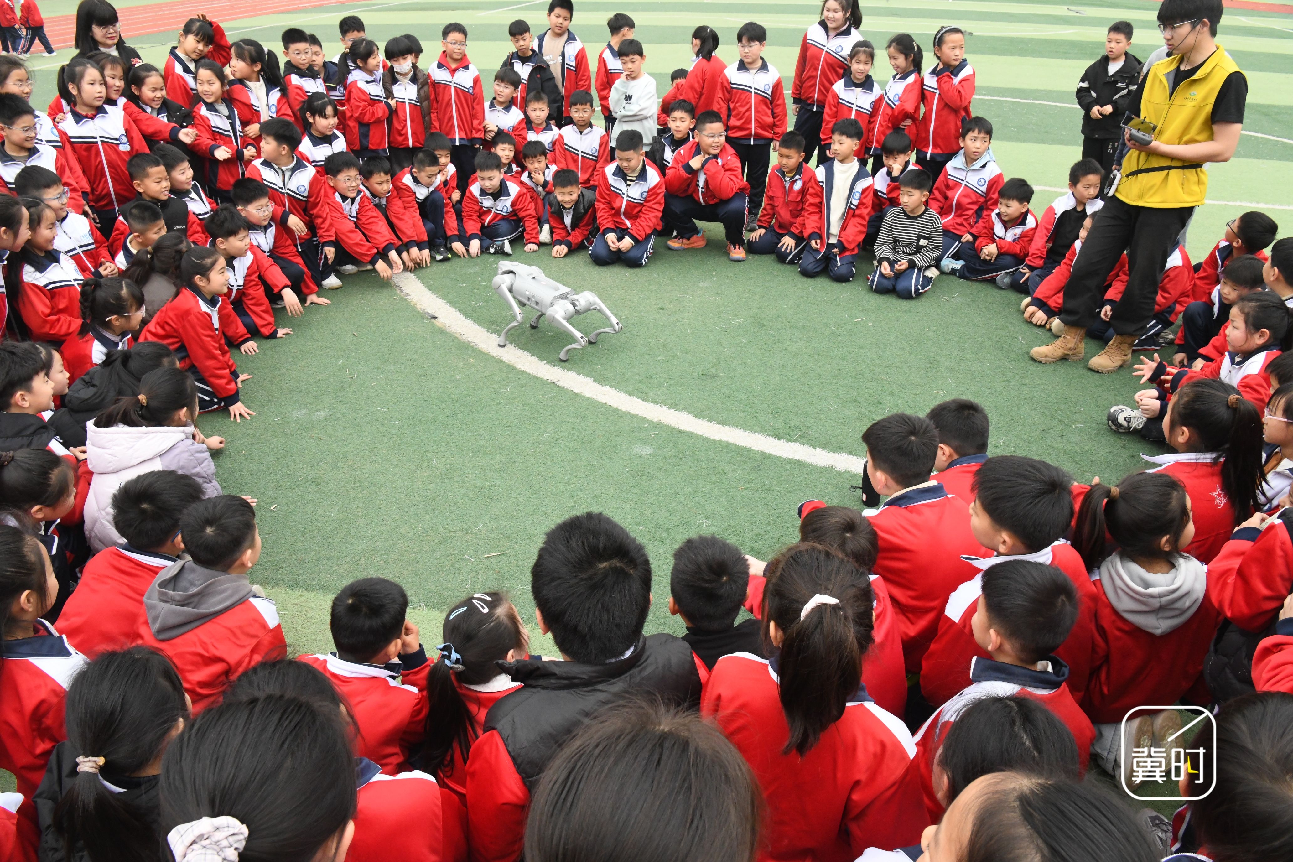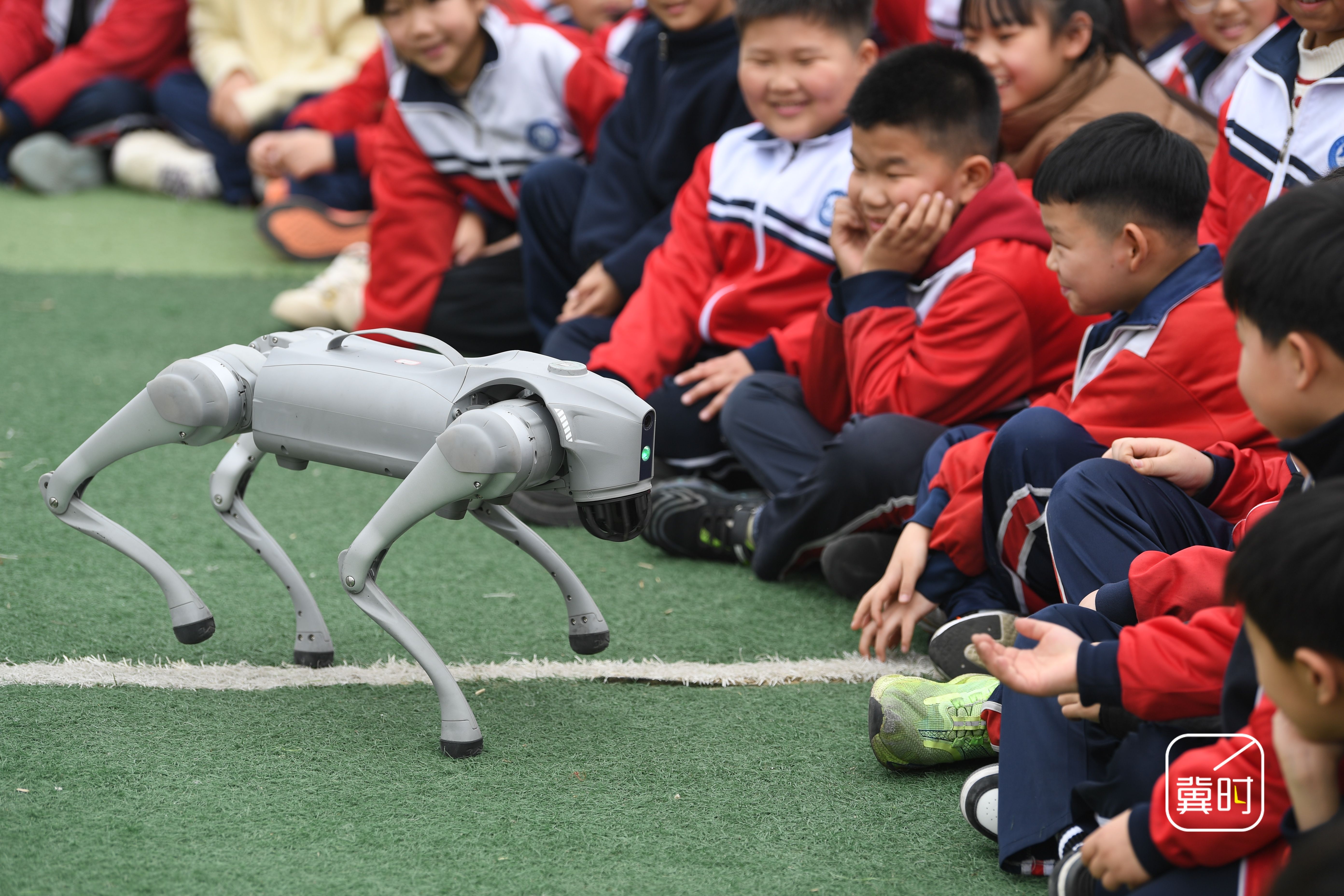 3月23日,河北省邯郸市广平县第一实验小学学生在观赏智能机器狗表演。