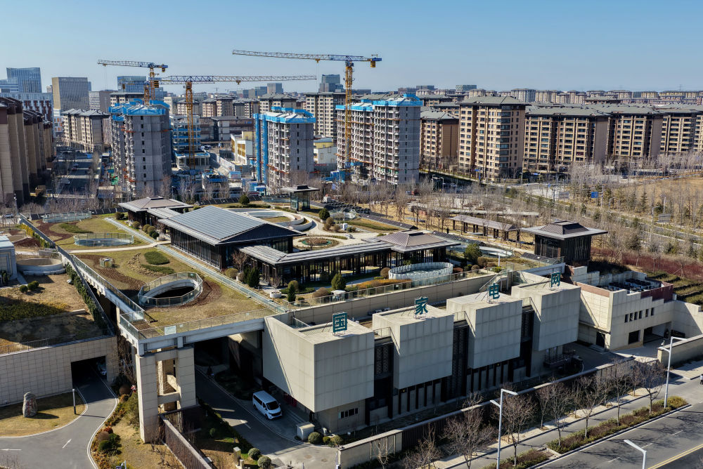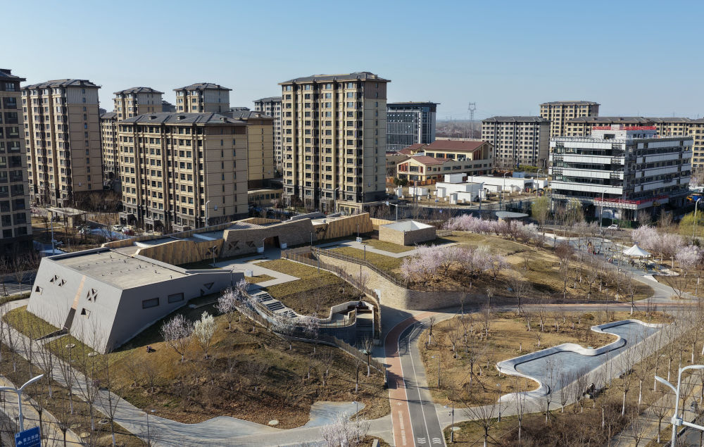 ↑ 这是3月18日拍摄的河北雄安新区“智慧能源立方”——剧村220千伏变电站外景(无人机照片)。该变电站屋顶覆土建设成公园,形成与城市融合共生的图景。