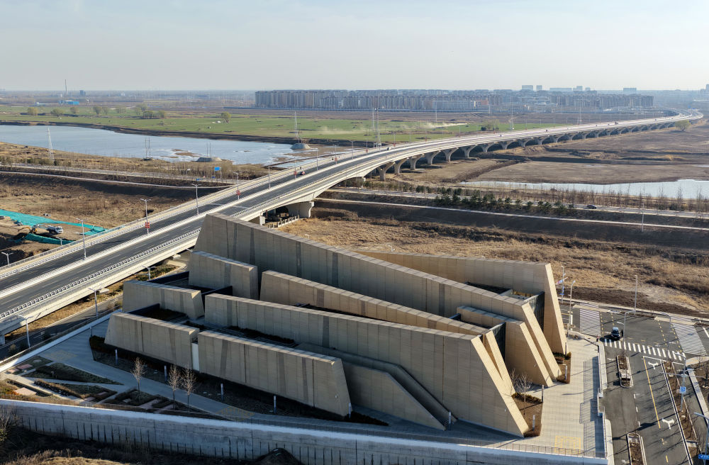 ↑ 这是3月18日拍摄的河北雄安新区“桃源梦境”——段沙110千伏变电站外景(无人机照片)。该变电站建筑整体呈矩形布置,面向公园一侧建筑高度降低,一层由中间打通,形成一个视觉通廊,与周边景观充分融合。