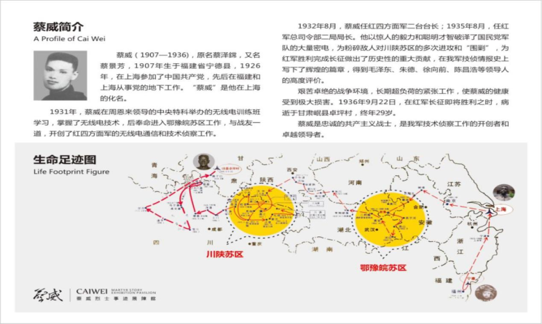 1932年,蔡威在外执行任务期间遭国民党军包围,面对数十名敌特追击,他临危不惧,子弹呼啸而过,只见蔡威将随身的密码本一页页撕碎塞入口中,生生嚼烂吞入腹中,这一幕也成为红军无线电通信培训的“保密第一课”。危急时刻,蔡威还不忘抛撒银元迷惑追兵,为战友转移争取时间。“人在密码在,人亡密码亡”,蔡威用生命践行了红军无线电台铁的纪律和对党绝对忠诚的信仰。