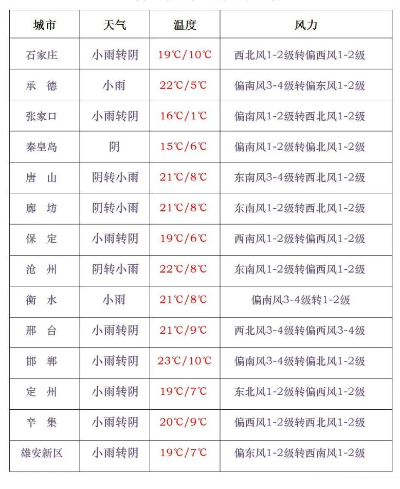 今天白天,全省多云转阴,张家口、承德、唐山北部、秦皇岛北部、保定、雄安新区、廊坊、石家庄、沧州西部、衡水、邢台、邯郸多云转阴有小雨或雷阵雨,局地有中雨。