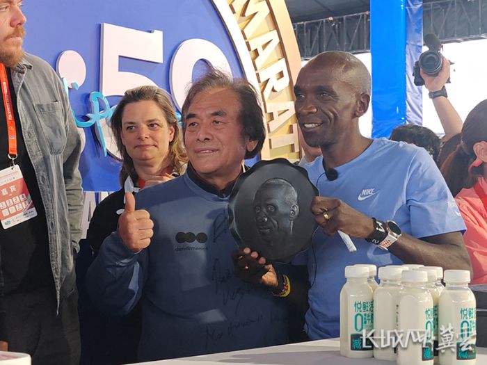 活动现场,石家庄文旅进行了全域旅游推介。马拉松传奇名将埃鲁德·基普乔格和央视主持人朱迅亲临现场,河北省级非物质文化遗产代表性项目郭氏铁板浮雕传承人郭海博、省级非物质文化遗产代表性项目无极剪纸传承人牛世民,分别为基普乔格精心准备了铁板浮雕人物像和剪纸人物像。奥运冠军常园受邀成为“石家庄文化旅游推广大使”。