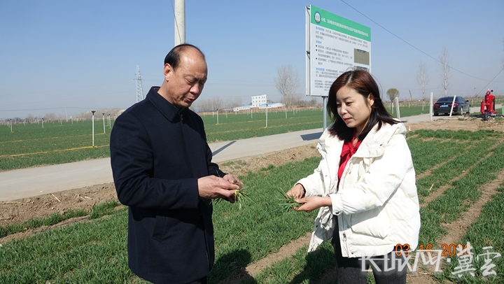 周村党支部书记、村委会主任周顺东(左)与河北人人邦农业服务有限公司副总经理于丛娜在麦田里察看小麦分蘖情况。长城网·冀云客户端记者 吴新光 摄