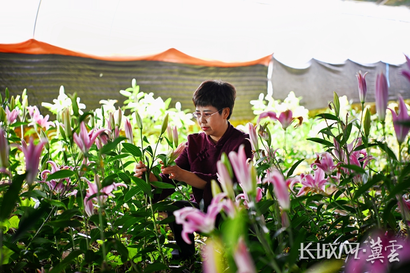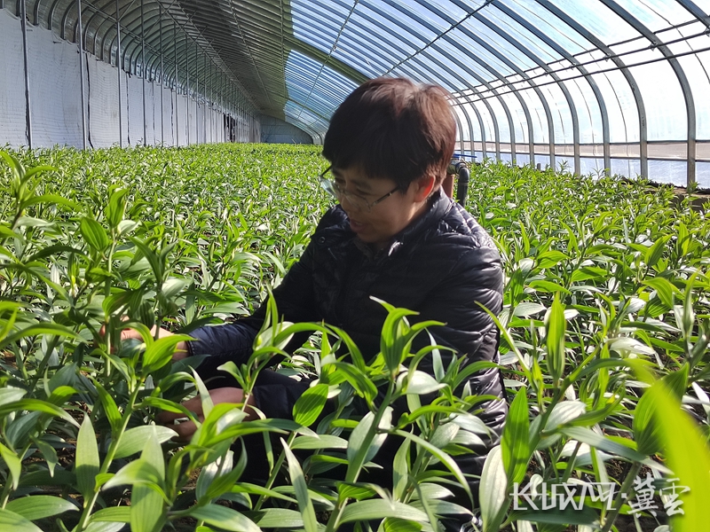 孙喜玲正在查看百合花长势。孙喜玲 供图