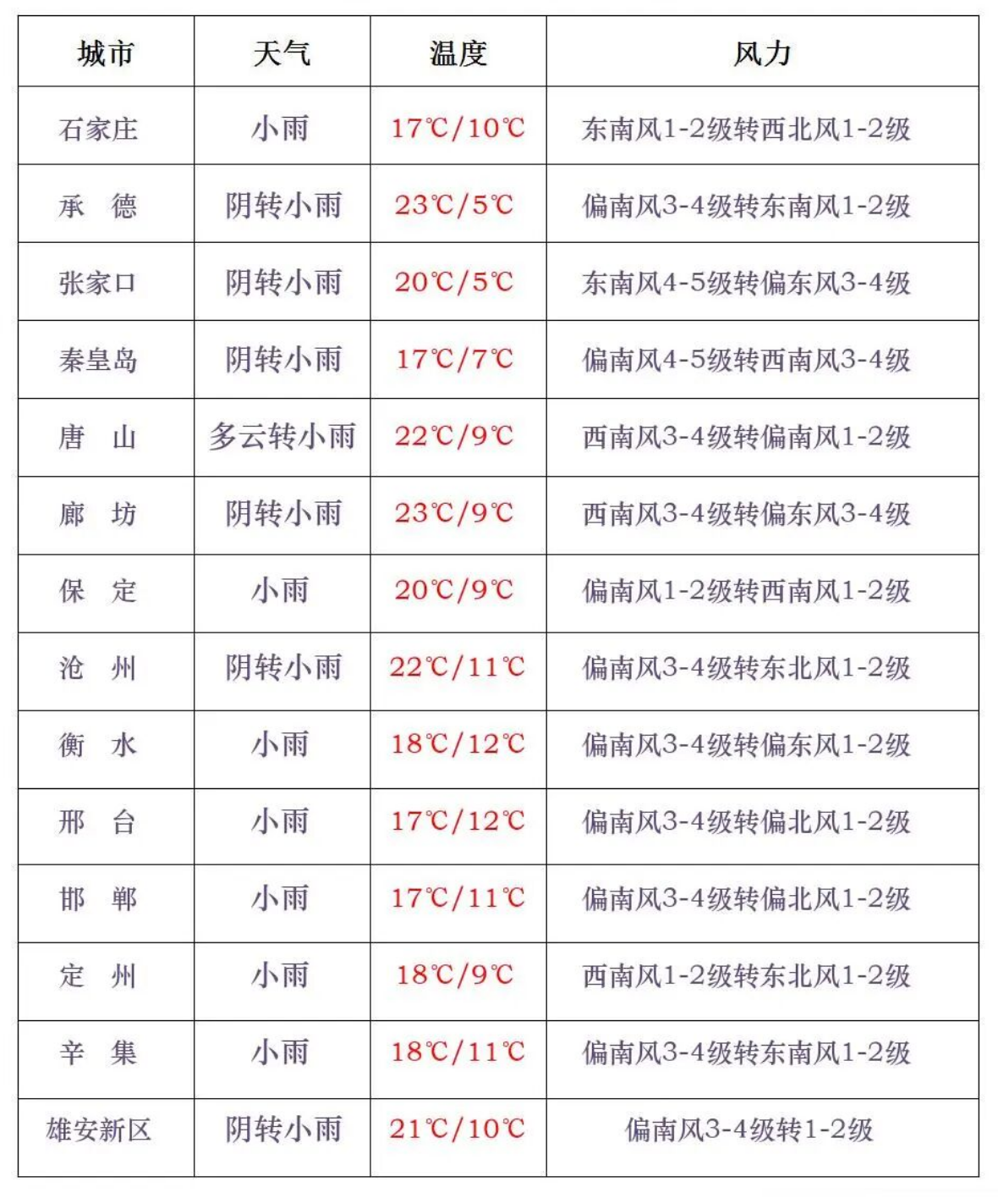 今天白天,全省多云转阴,张家口、承德西部、保定、石家庄、沧州西部、衡水、邢台、邯郸有小雨或零星小雨。