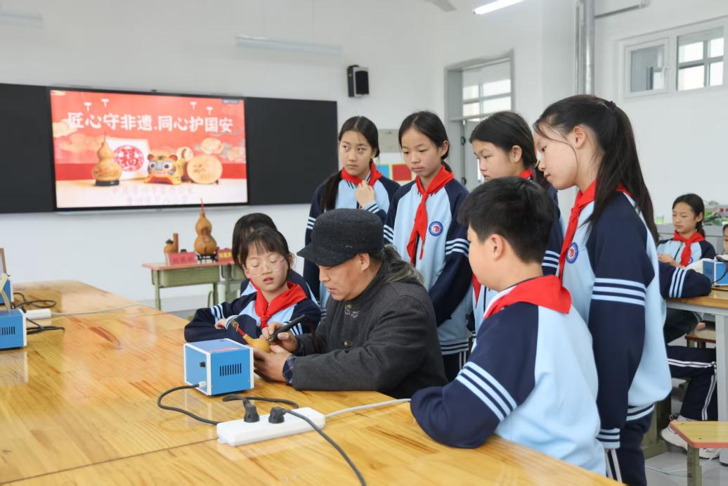 为深入贯彻总体国家安全观,创新国家安全教育宣传形式,在“4·15”全民国家安全教育日来临之际,4月9日,晋州市在市第八小学举办“匠心守非遗 同心护国安”国家安全主题非遗体验活动。活动特邀省级非遗葫芦烙画传承人刘保秋、石家庄市级非遗布老虎传承人刘凤巧、石家庄市级非遗剪纸传承人张清菊现场传艺授课,让青少年在指尖非遗中感悟传统文化魅力、厚植家国情怀。