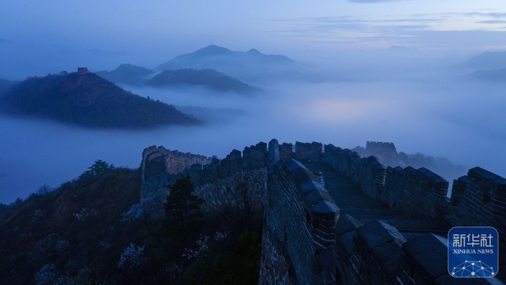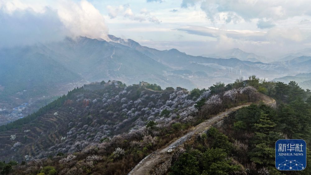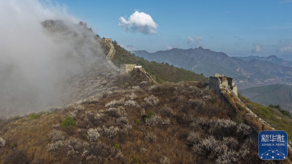 ↑ 这是4月10日在河北省迁安市拍摄的雨后古长城晨景(无人机照片)。新华社发(刘满仓摄)