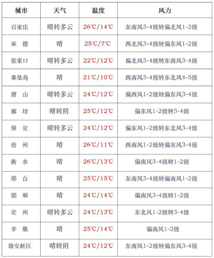 今天白天,全省晴间多云。今天夜间到13日,张家口、保定、雄安新区、廊坊、石家庄西部多云转阴有分散性阵雨,其他地区晴转多云。