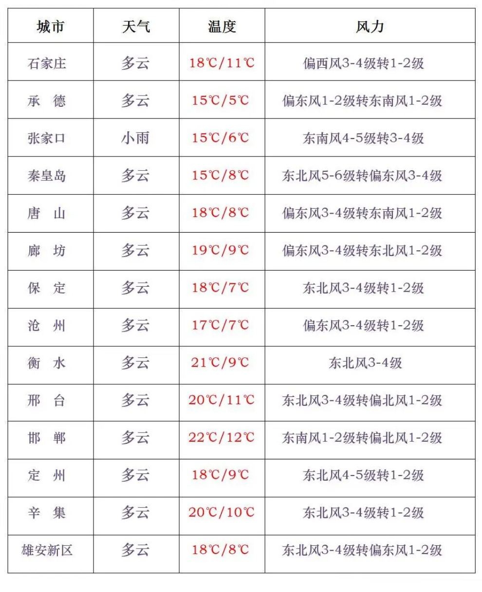 今天白天,张家口、承德北部、保定西部、石家庄西北部多云间阴有小雨或零星阵雨,其他地区多云间晴。今明早晨,全省大部分地区最低气温下降3~6℃。