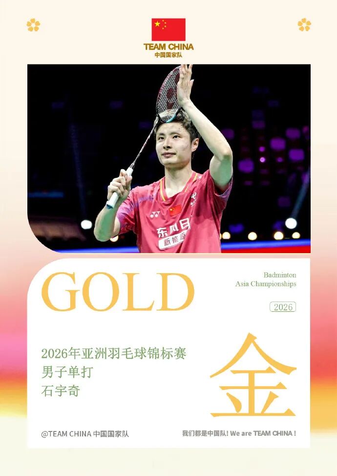 北京时间4月12日,2026亚洲羽毛球锦标赛男单决赛,中国选手石宇奇2:0战胜印度选手阿尤什·谢蒂,首次夺得该项赛事冠军。