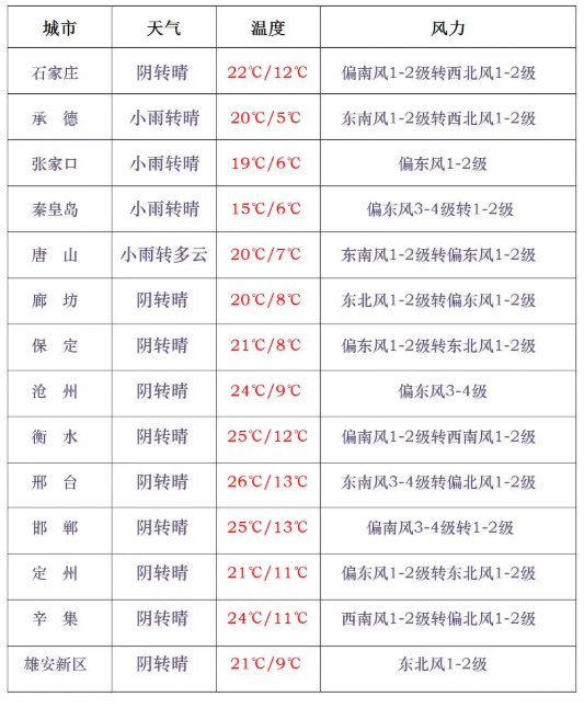 今天白天,保定、廊坊以北地区和石家庄、邢台、邯郸三个地区的西部阴有阵雨或雷阵雨转多云,其他地区多云转晴。今天夜间到15日,全省晴间多云。