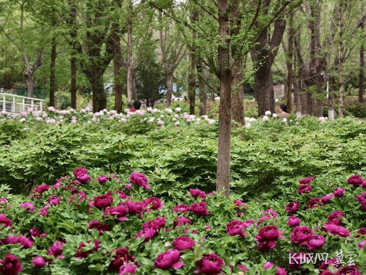该牡丹园共有80余个珍贵品种、2万余株牡丹,涵盖7大色系,雪映桃花、白王狮子等多个品种交织错落、香气弥漫。因牡丹生长对光照要求较高,为提升观赏效果,技术人员移栽了80余棵遮挡光照的树木,调整植株布局保障牡丹充分接受光照。在科学管护下,牡丹园区生机盎然。