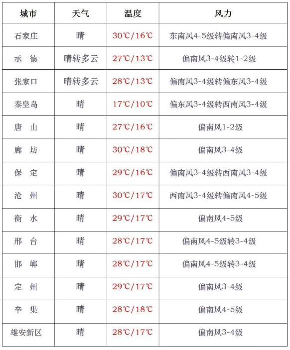 今天白天,张家口北部、承德北部多云间晴,其他地区晴间多云。全省大部分地区有偏南风4到5级,阵风6到7级,局地可达8级。今天夜间到明天,全省晴转阴,大部分地区有雷阵雨或阵雨。