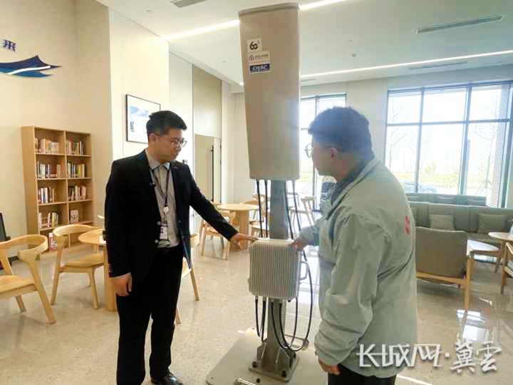 通号低空智能科技有限公司研发工程师贾树葱(左)向记者介绍面向6G无蜂窝网络架构的低空通信基站设备。长城网·冀云客户端记者 贾宏博 摄