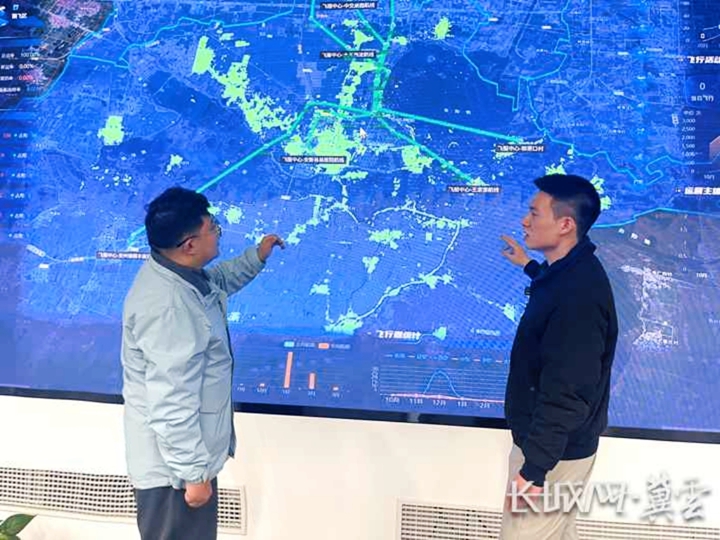 通号低空公司雄安新区项目经理何润洲(右)向记者介绍低空空域智能管控系统。长城网·冀云客户端记者 贾宏博 摄